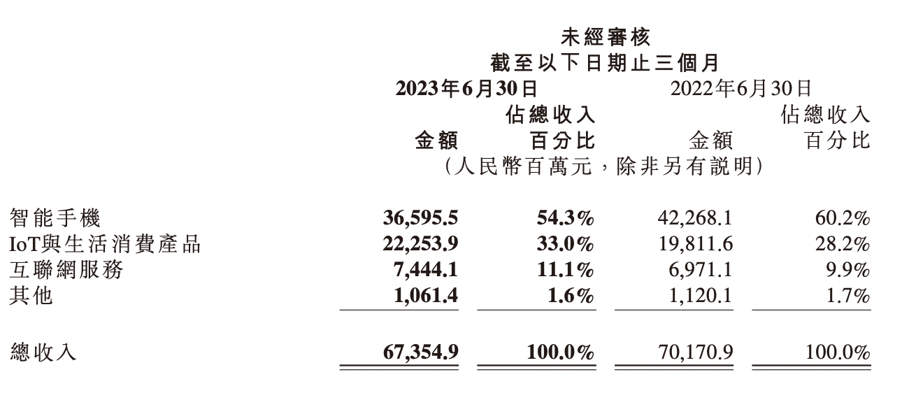 物联网和消费产品方面,小米本季度营收223亿元,同比增长12.3%;毛利率达到17.6%,同比上升3.3%。截至2023年6月30日,小米AIoT平台接入的物联网设备(不包括智能手机、平板电脑和笔记本电脑)数量达到6.545亿,同比增长24.2%。2023年6月,米家APP月活跃用户数同比增长17.1%,达到8290万。互联网服务方面,小米本季度营收74亿元,同比增长6.8%;毛利率达到74.1%,同比上升1.1%。