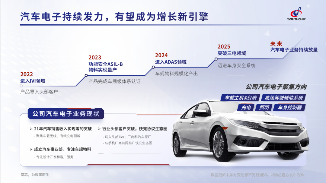 南新科技从车载无线有线充电切入汽车头部厂商。凭借快速迭代和持续创新的能力,不断拓展新品类布局,在汽车仪表、智能驾驶舱、ADAS、BMS等领域进行产品布局规划。报告期内,公司USB和无线充电解决方案在客户端实现量产;高性能DC-DC功率芯片、高端开关等新产品已在客户端实现规模样片交付,部分客户已进入项目定点设计阶段。