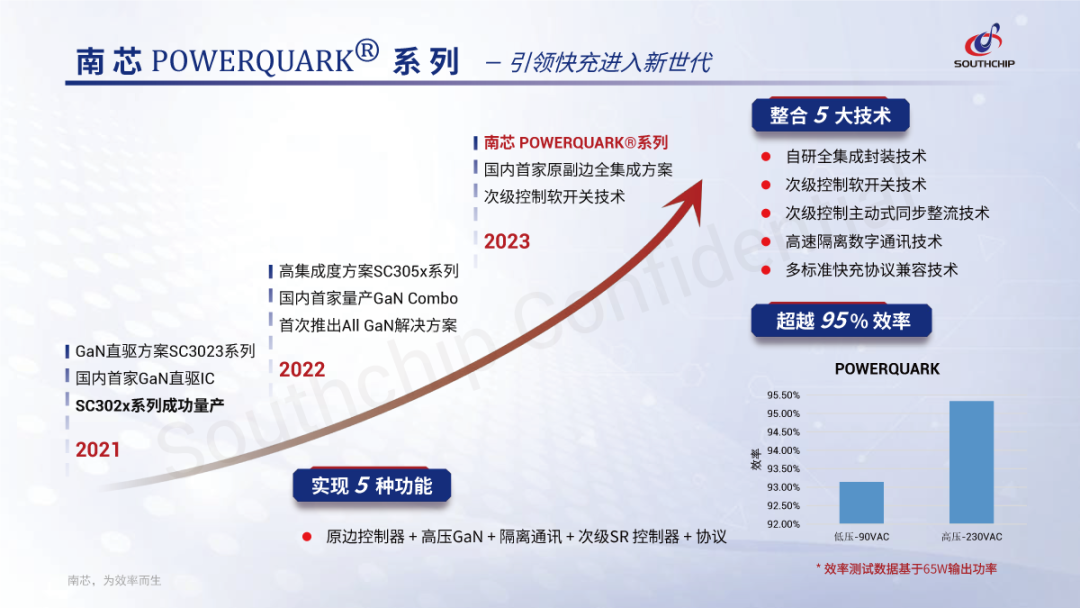 除了电荷泵充电管理芯片,南芯科技上半年推出了高功率密度、高集成度的AC-DC电源管理芯片,对应的注册商标为POWERQUARK,集成了五大技术,高压下最高效率可达95%。产品处于行业前列,适用于PD快充、适配器等应用。