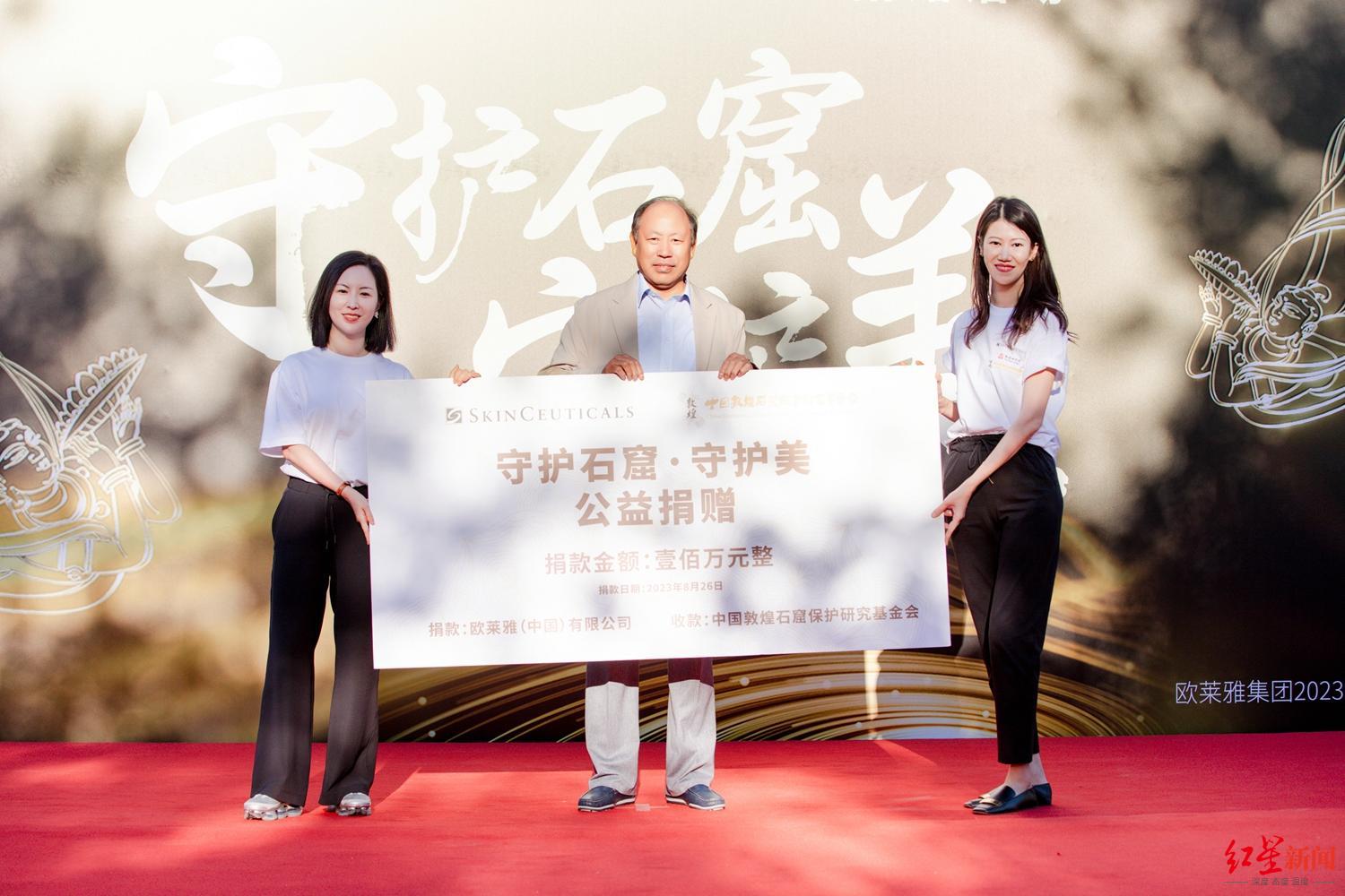 捐赠现场合影(从左至右:秀力客品牌及医美品类总经理、中国敦煌石窟保护研究基金会理事长杨、秀力客品牌副总经理何玛丽)
