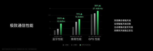 此外,Find N3 Flip搭载了多项OPPO领先的通信技术,提供更可靠的连接体验。相比其他小折叠产品,Find N3翻盖支持双层耦合增强型天线、全局智能天线切换、主动增强型蓝牙天线、双频双天线独立定位,大大提升了蓝牙、蜂窝、GPS的性能。