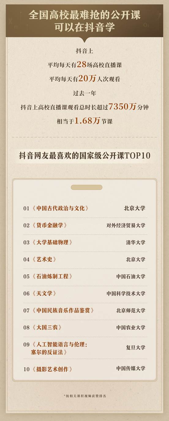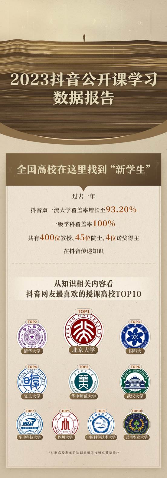 同时,《2023年Tik Tok公开课学习数据报告》(以下简称《报告》)显示,过去一年,国内高校在Tik Tok直播1万场,总时长超过7350万分钟,相当于1.68万节课。Tik Tok双一流大学公开课覆盖率提高到93.2%,一流学科覆盖率达到100%。共有400名教授、45名院士和4名诺贝尔奖获得者在Tik Tok传授他们的知识。