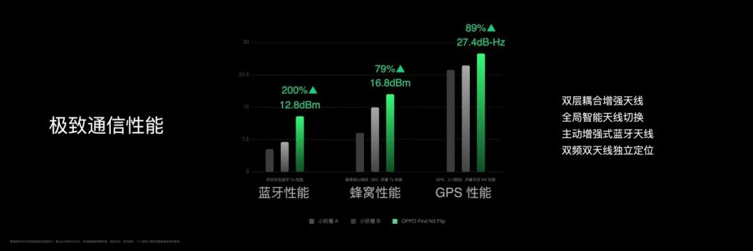 此外,Find N3 Flip搭载了多项OPPO领先的通信技术,提供更可靠的连接体验。相比其他小折叠产品,Find N3翻盖支持双层耦合增强型天线、全局智能天线切换、主动增强型蓝牙天线、双频双天线独立定位,大大提升了蓝牙、蜂窝、GPS的性能。