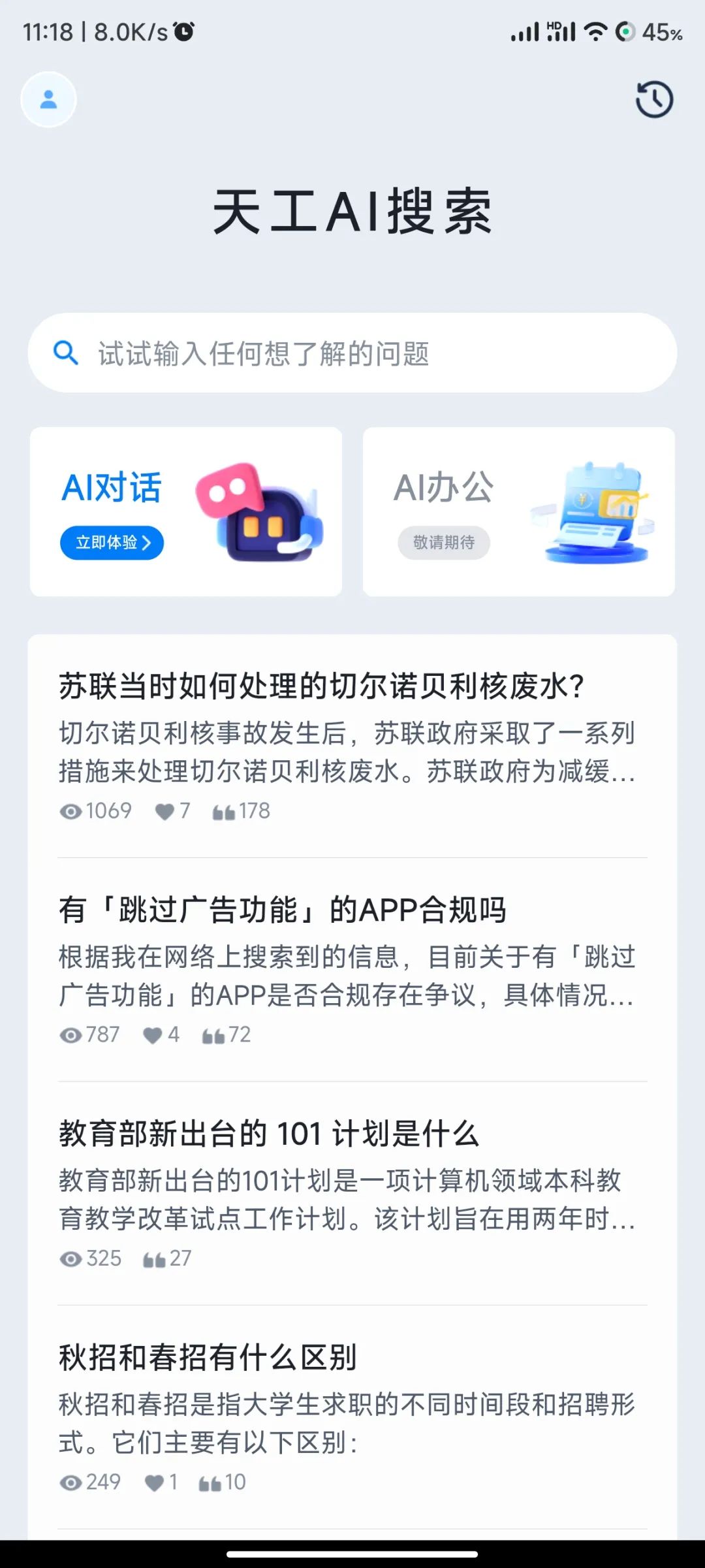 这款 APP 名叫「天工 AI 助手」,新用户下载就能体验,如果是老用户,也只需要更新 APP 就能体验。它的用户界面设计很简单:在搜索框中点进去,就可以问自己想要了解的任何问题了。另外,利用「AI 对话」功能,你还可以体验与天工 AI 助手聊天互动、创作文本等常规大模型的能力。