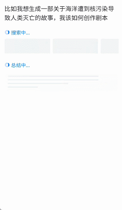 接着追问,我想写一个以海洋遭到核污染导致人类灭亡为主题的故事,但不知道如何创作剧本。同样交给天工 AI 搜索,回答依然条理清晰、逻辑性强。