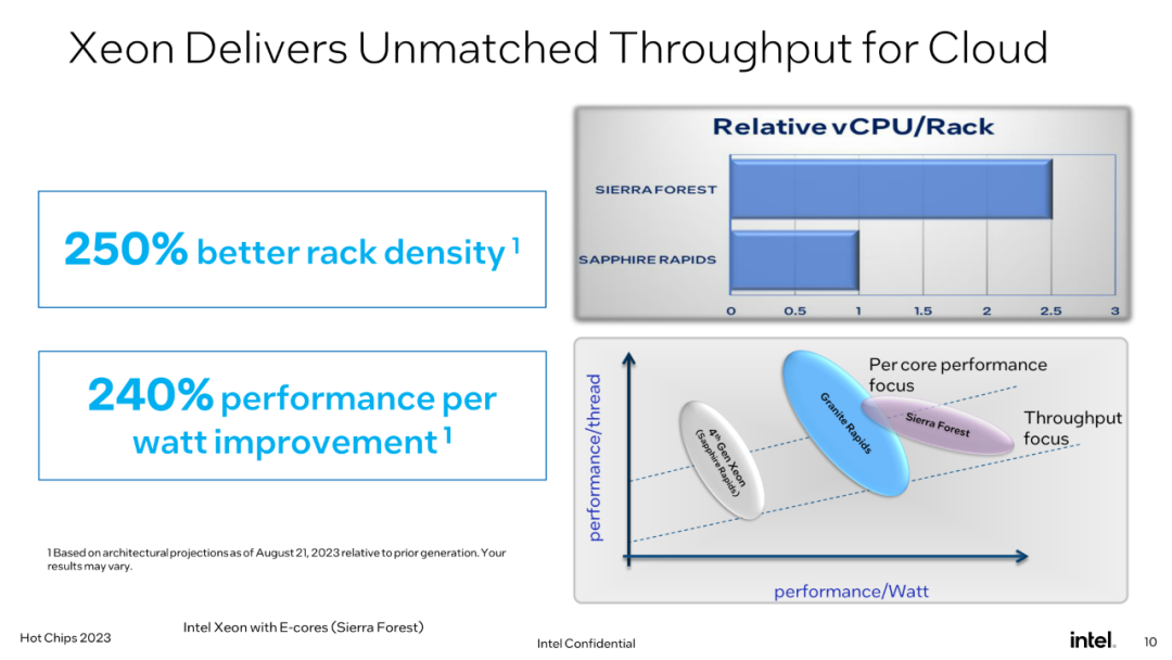 同时,英特尔首次将其数据中心芯片分为两类:一类是花岗岩激流,主打高能耗、高性能;一个是Sierra Forest,专注于能源效率。