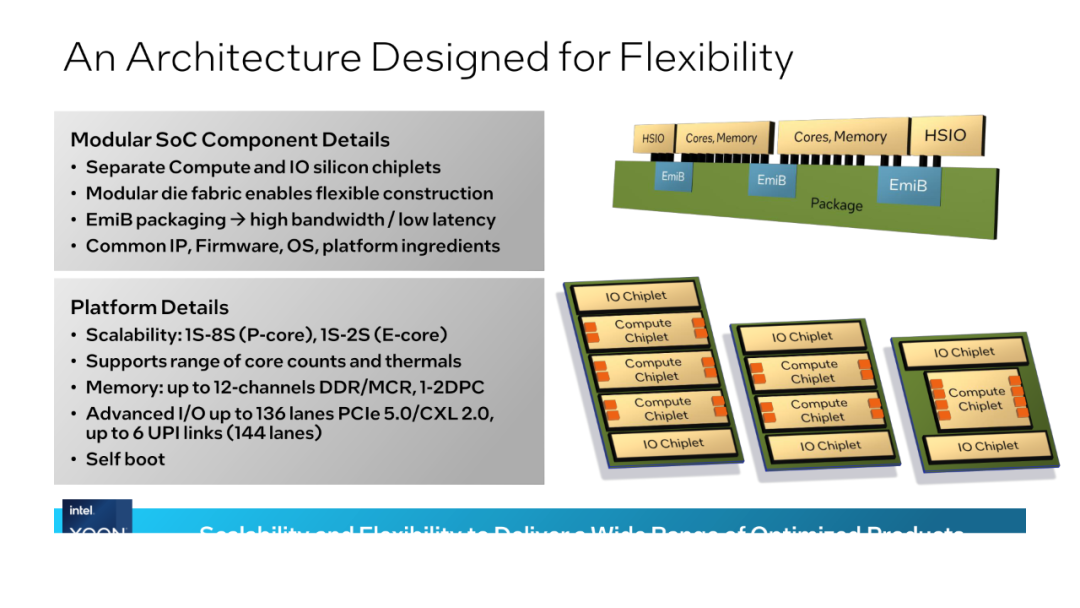 在设计上,Granite和Sierra都是基于小芯片的设计,它们依赖于由英特尔Emib(嵌入式多芯片互连桥)技术封装的计算和I/O小芯片的结合。而且,这种小芯片设计很独特,使用不同的计算/IO小芯片,而不是将“完整的”至强小芯片封装在一起。