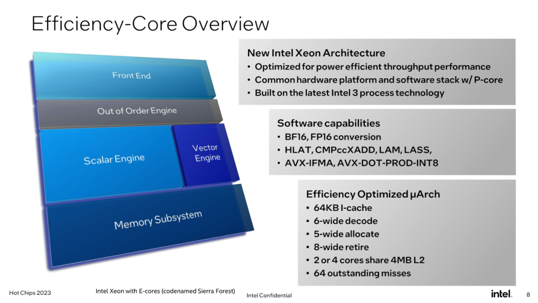 如上所述,这是英特尔首次尝试为至强市场提供E-core。对于英特尔来说,这意味着针对数据中心工作负载调整E核设计,这与上一代以消费应用为中心的E核设计有很大不同。