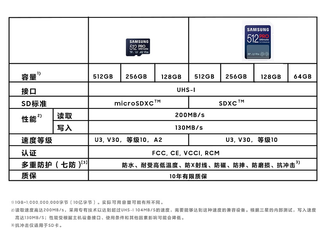 由于控制器增强的纠错码(ECC)引擎和多重保护功能,三星PRO Ultimate系列存储卡可以为专业摄影师和创作者提供可靠的性能,并确保长期数据存储更加安全。