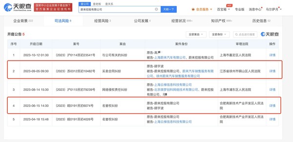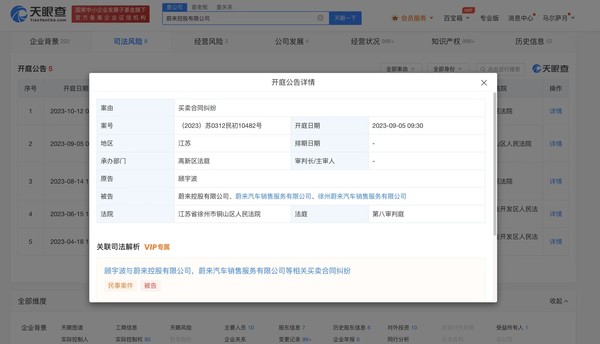 【CNMO新闻】天眼查App显示,蔚来控股有限公司、蔚来汽车销售服务有限公司、徐州蔚来汽车销售服务有限公司近日新增一份法院公告。原告是顾玉波(Tik Tok账号“小牛说车”的持有人),本案起因是一起买卖合同纠纷。该案将于9月5日在江苏省徐州市铜山区人民法院开庭审理。