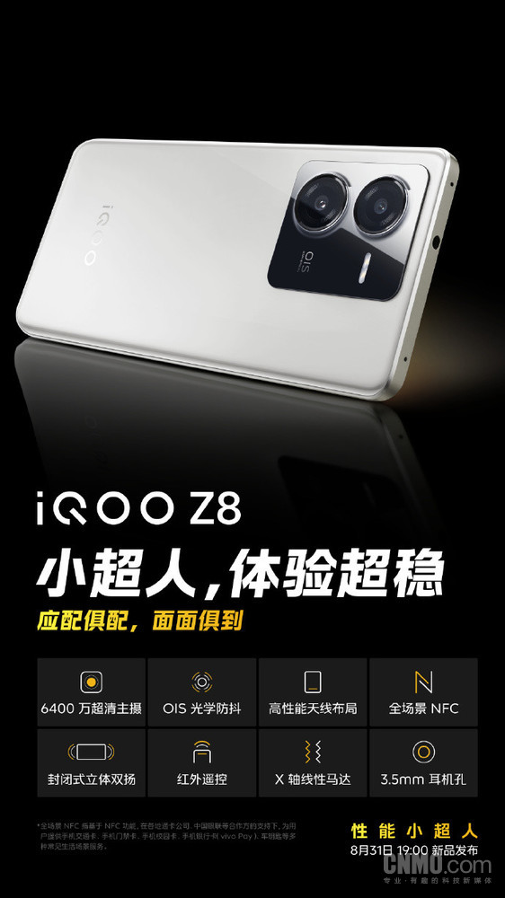 IQOO Z8官方宣布搭载6400万像素超清主摄像头,预留3.5mm耳机接口。