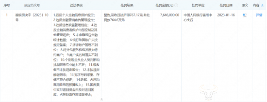 值得一提的是,今年年初,厦门银行因“违反个人金融信息保护规定、未准确报送金融统计数据、未按规定进行银行结算账户备案、未妥善管理欺诈账户、将外包服务机构发展为特约商户”等多项违法事实被中国人民银行福州中心支行警告,其违法所得被没收7.6717元,同时还被罚款764.6万元。