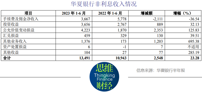 具体来看,华夏银行上半年公允价值变动收益42.23亿元,同比增长125.83%;投资收益36.56亿元,同比增长32.13%;其他业务收入13.76亿元,同比增长695.38%;手续费及佣金净收入降至36.67亿元,同比下降36.54%。
