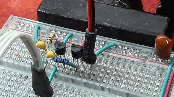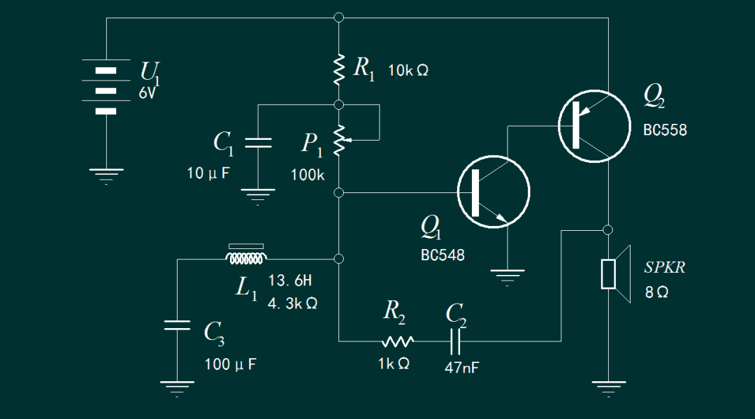 我在很早之前就知道这个电路,在这个电路中 Q1的基极上,如果对地之间增加一个大的电感和电容的串联,就会出现比较神奇的振荡现象。电感和电容的串联谐振会周期改变电路振荡频率,让声响听起来具有不同的特效。下面测试一下。
