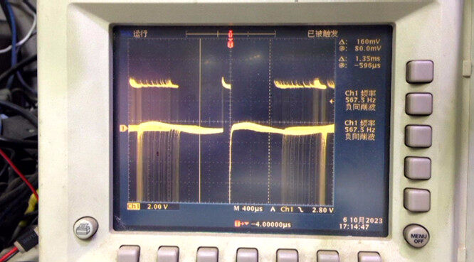 下面更换一个8欧姆的扬声器在进行测试,可以听到扬声器的声音更加响亮。这也许和扬声器的直径大 这个因素有关系。示波器显示扬声器上的波形,可以看到底部有扬声器共振所感应的电动势。也就是在输出截止的时候,会出现扬声器震动感应电压。