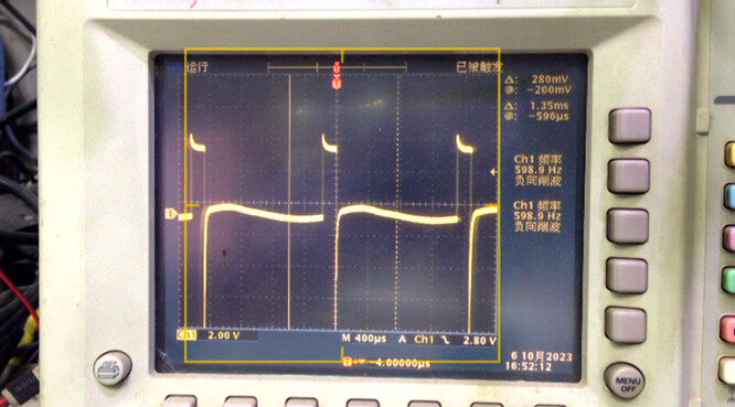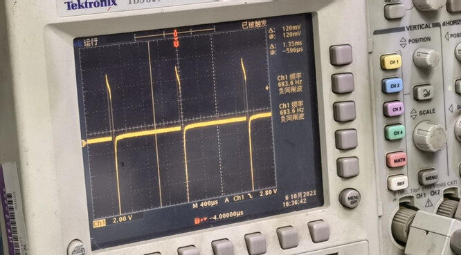 施加6V工作电源,可以听到动圈式扬声器中发出蜂鸣声音。随着 100k 可调电阻的变化,声音的频率也跟随变化。但这个频率就是单一的振荡频率。难道这就是 RobCom声音? 示波器上显示出扬声器上的电压波形。