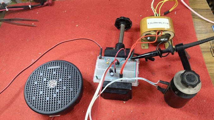 按照上面的电路图,在面包板上搭建该电路。电路中的所有参数,与书中的都相同。使用一个多圈100k电位器作为图中 P1 可调电阻。带有外壳的 4欧姆扬声器,通过接头插接在面包板上。其它元器件安放在面包板上。接下来上电来进行测试。