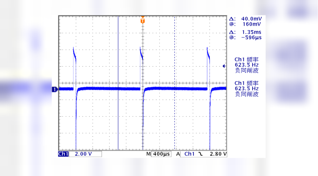 扬声器的波形呈现上下交流电压。最高峰值为电压电源。但反向则是一个非常负值的尖脉冲,这应该是由于扬声器线圈的电感,在输出PNP三极管突然截止时出现的感应电压。