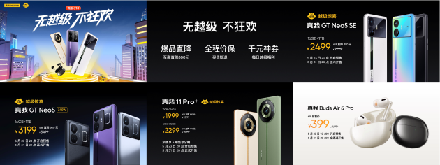 最后,真我618带来了五大越级王牌。首先,“也许是行业1TB” 车型最丰富的品牌”,真正的GT Neo5系列与真我11Pro系列携手打造首款“1TB大存储手机王牌”; “3K 超级闪充王牌,真我GT Neo5最高立减300元,240W 16GB 1TB版只需3199元,“2K 真我GTGT性能续航王牌 Neo5 SE最高立减300元,16GB 1TB版只需2499元,“2K 档质感影像王牌“真我” 11 Pro 低至1999元,预售可享受6期分期免息。“千元内旗舰耳机王牌”真我 Buds Air 5 Pro 618到手价399元。