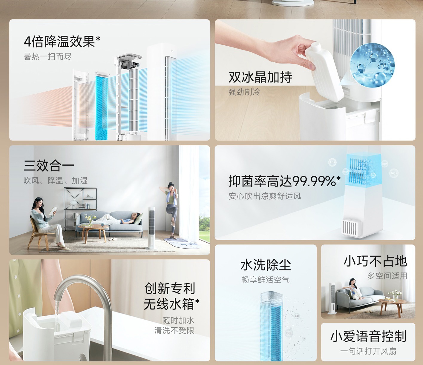 米佳智能蒸发冷却风扇配备循环水冷却系统,可添加水和冰晶,带来不同的冷却效果;采用创新的无线水箱专利设计,可随时清洗;内置银离子抗菌模块,抗菌率高达 99.99%;搭载 0.4 米超长出风口,拥有 10 超长送风距离米。
