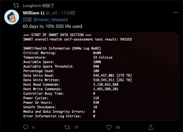 比如之前 Mac 的一些 BUG ,导致用户使用 60 天就消耗了这一块 256G 闪存 10% 写入寿命。