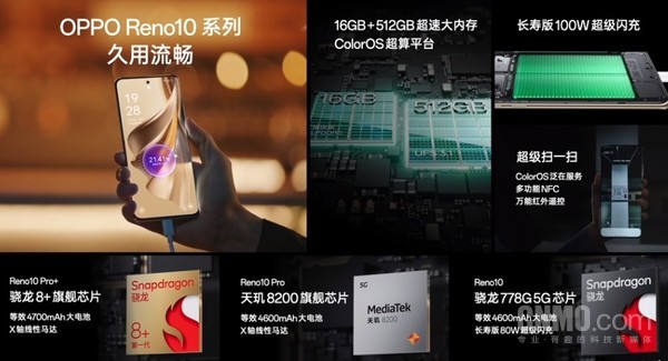 续航方面,OPPO Reno10和Reno10 Pro还内置4600mah长寿电池,前者支持80W超级闪充,后者支持100W超级闪充;Reno10 Pro 内置4700mah长寿电池,支持100W超级闪充。其他方面,OPPO NFC和红外线都支持Reno10系列。