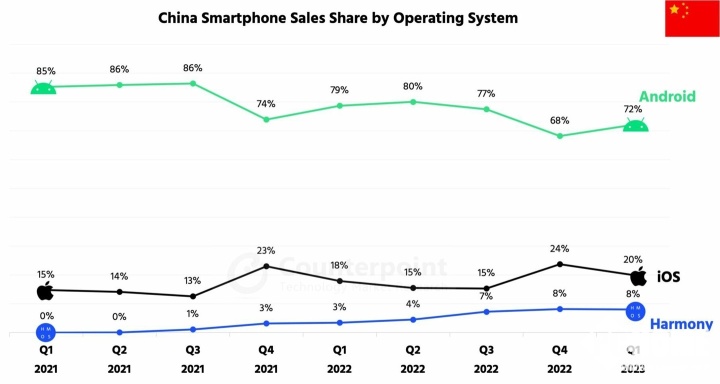 根据Counterpoint披露的数据,2023年Q1,鸿蒙操作系统在中国市场的市场份额为8%,是安卓和iOS之外的第三大手机操作系统。