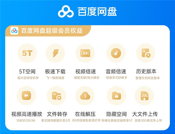 百度网络磁盘超级VIP会员拥有5T超大容量、快速下载、无上限批量上传、存储文件5W在线、在线云减压、视频高速通道、存储上限提升、自动备份、垃圾文件清理、20GB大文件上传、30天回收站有效期、自动备份等特权。