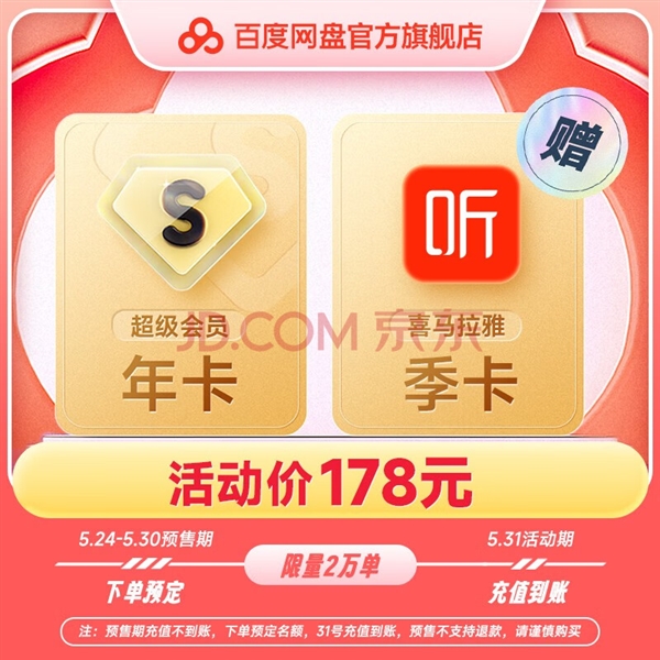 京东百度网盘官方旗舰店,百度网盘年卡预售升级,喜马拉雅2月卡升级为3个月季卡。