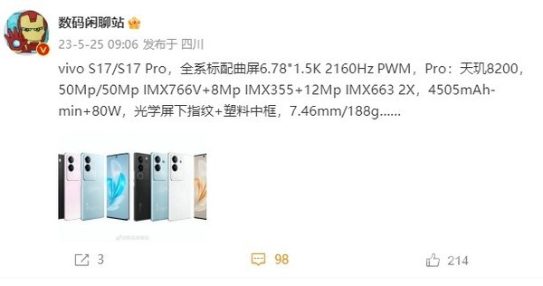 在其他配置方面,根据爆料,vivo S17 Pro将配备天竺8200芯片;内置4520mah容量电池,支持80W快速充电;光学屏下指纹;重量188g,厚度7.46mm。