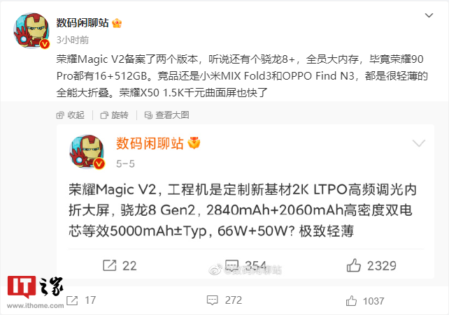 荣耀 Magic V2 据悉,比华为更轻的机身设计是一款折叠屏手机 Mate X3 还要轻薄。据 @数码闲聊站 据说这台机器的屏幕质量也很好,是专门定制的新基材 2K LTPO 高频调光屏不仅显示效果极佳,还能有效保护眼睛。该机还将配备一个等效的机器 5000mAh 大容量电池,支持 66W 有线快充和 50W 无线快充。荣耀 Magic V2 工程机有骁龙 8 及骁龙 8 Gen2 这个版本表明它将提供多种型号,但IT之家的猜测也可能是该机器在工程阶段测试不同处理器的效果,预计该机器将处于 7 月份正式发布。
