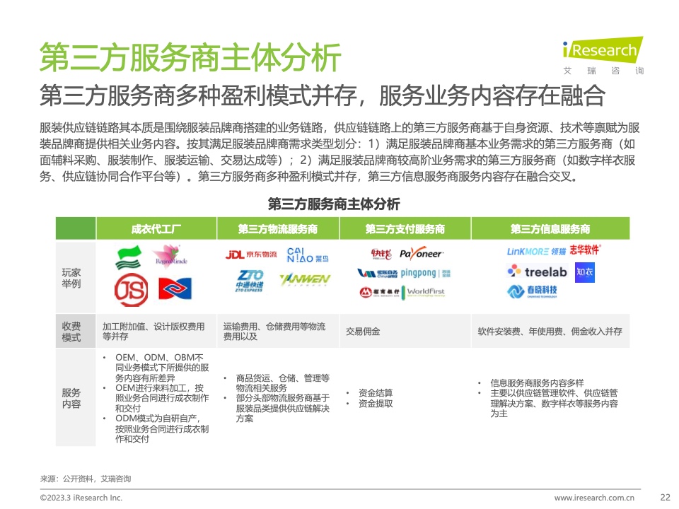 第三方服装供应链服务提供商通过加强技术手段应用,减少信息岛,加强供应链快速响应和小批量生产能力,帮助服装品牌优化供应链模式,更符合服装类消费特点,降低供应链三流成本,提高服装供应链整体盈余。