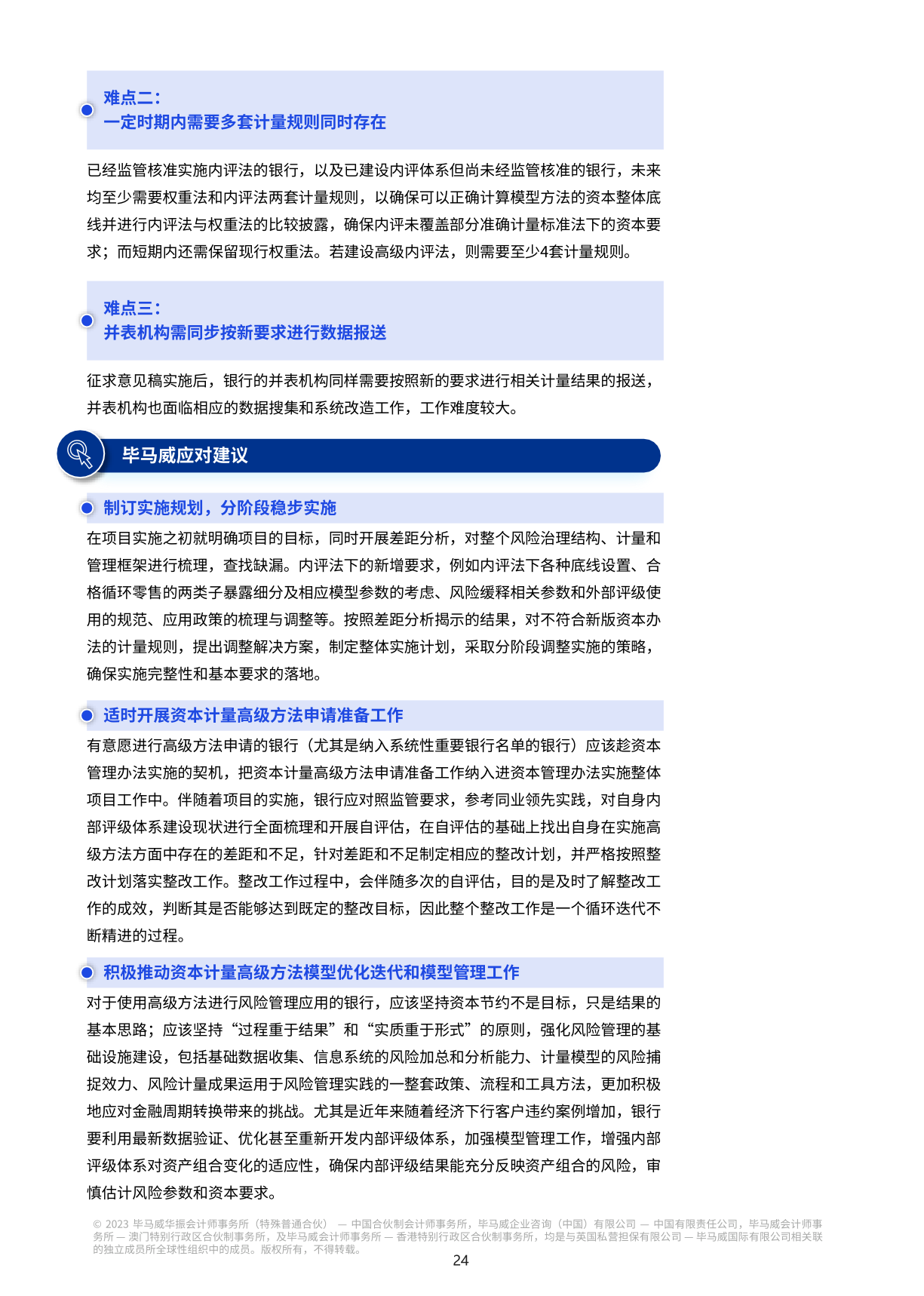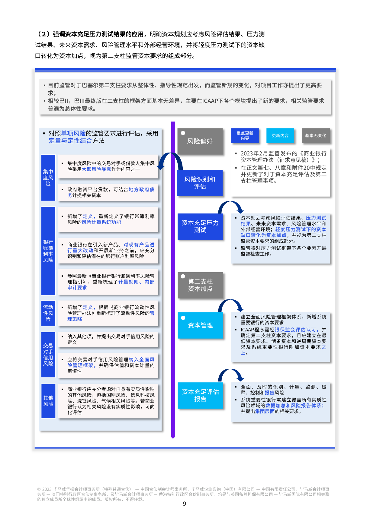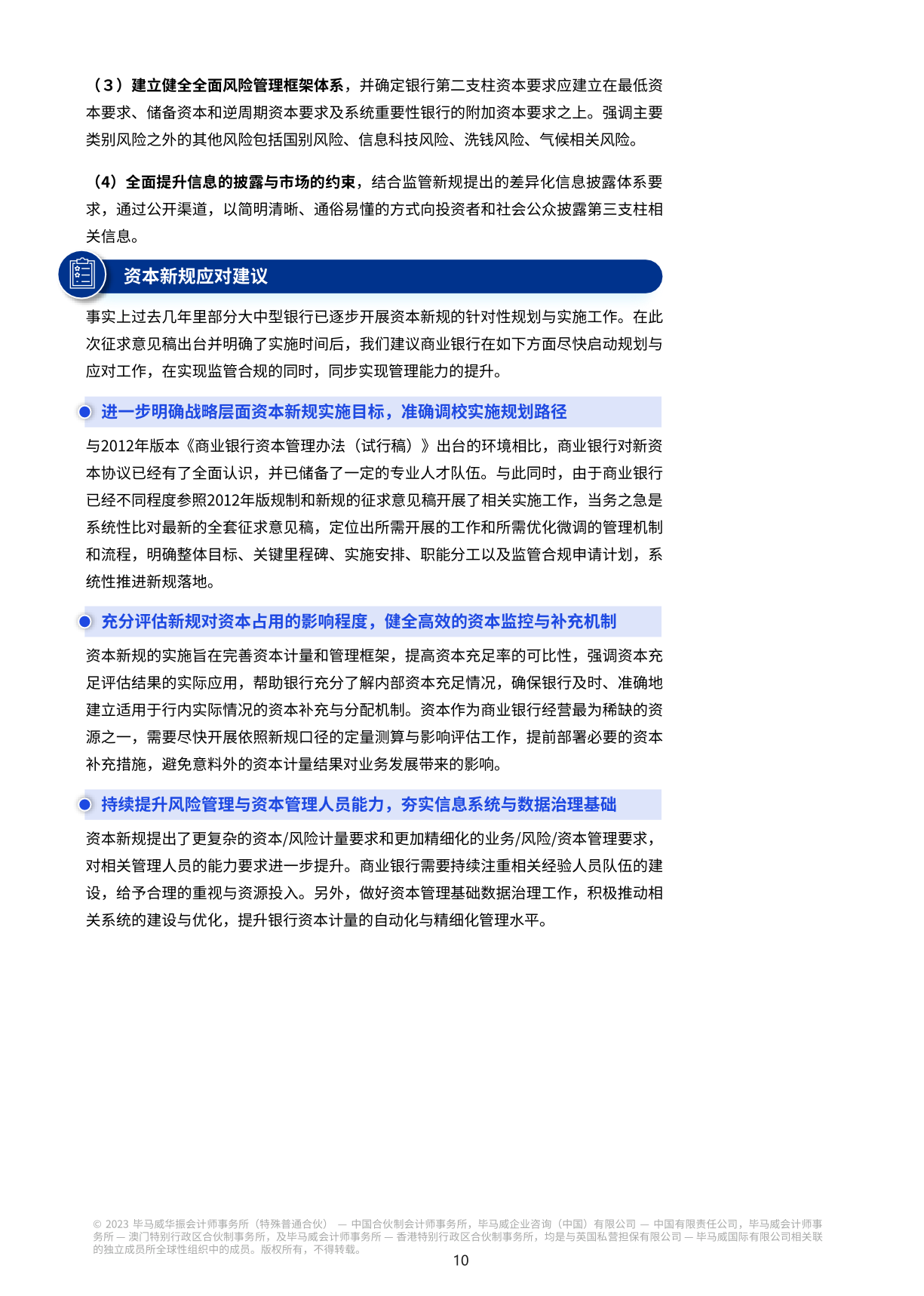 对我国各类商业银行来说,新资本规定的出台意味着新的变化和挑战。资本和风险加权资产计量规则的升级将提高银行对风险计量能力的要求;业务管理模式的转变将指导银行未来的业务发展方向;扩大和完善数据收集范围将加强银行风险管理的数据基础;管理信息系统的转型迫切需要更多的技术和经验支持;资本管理模式的转型将逐步融入银行绩效管理的转型。