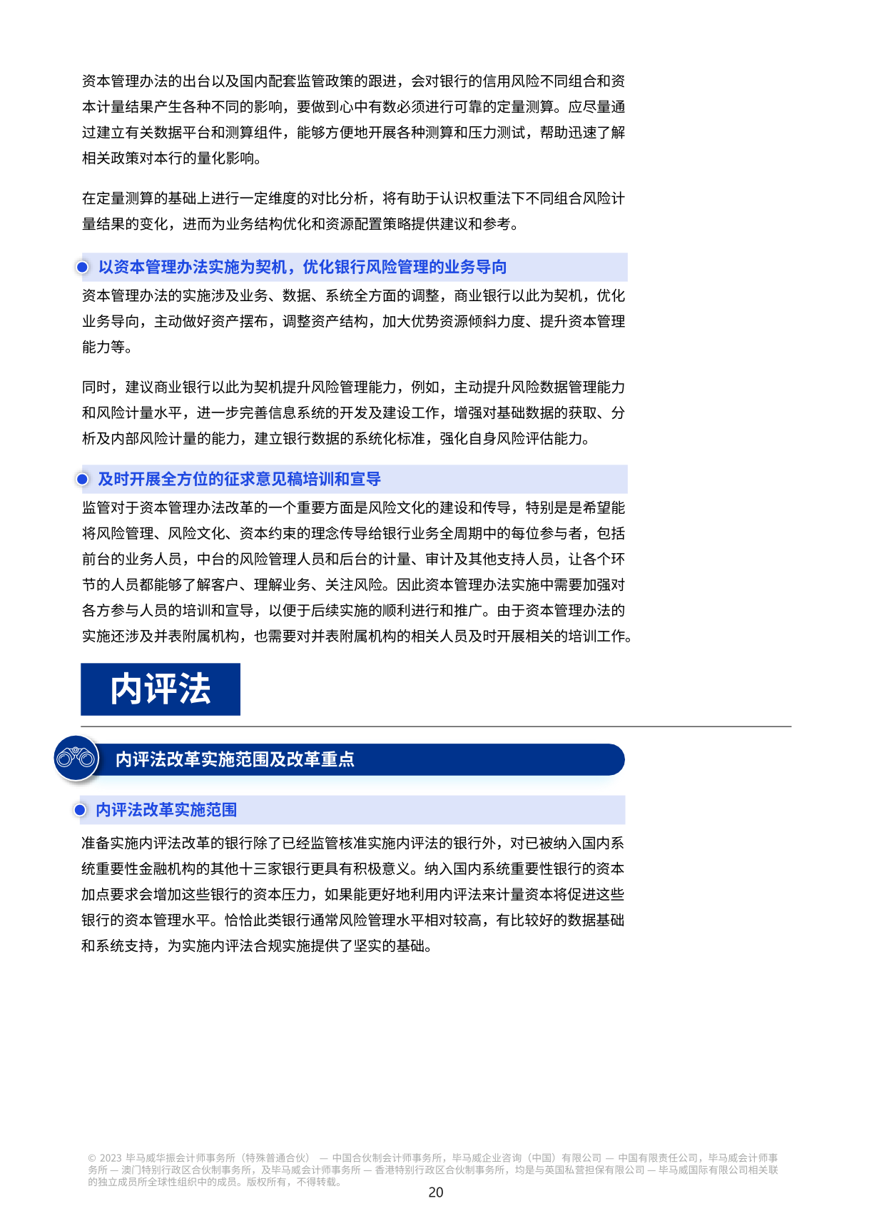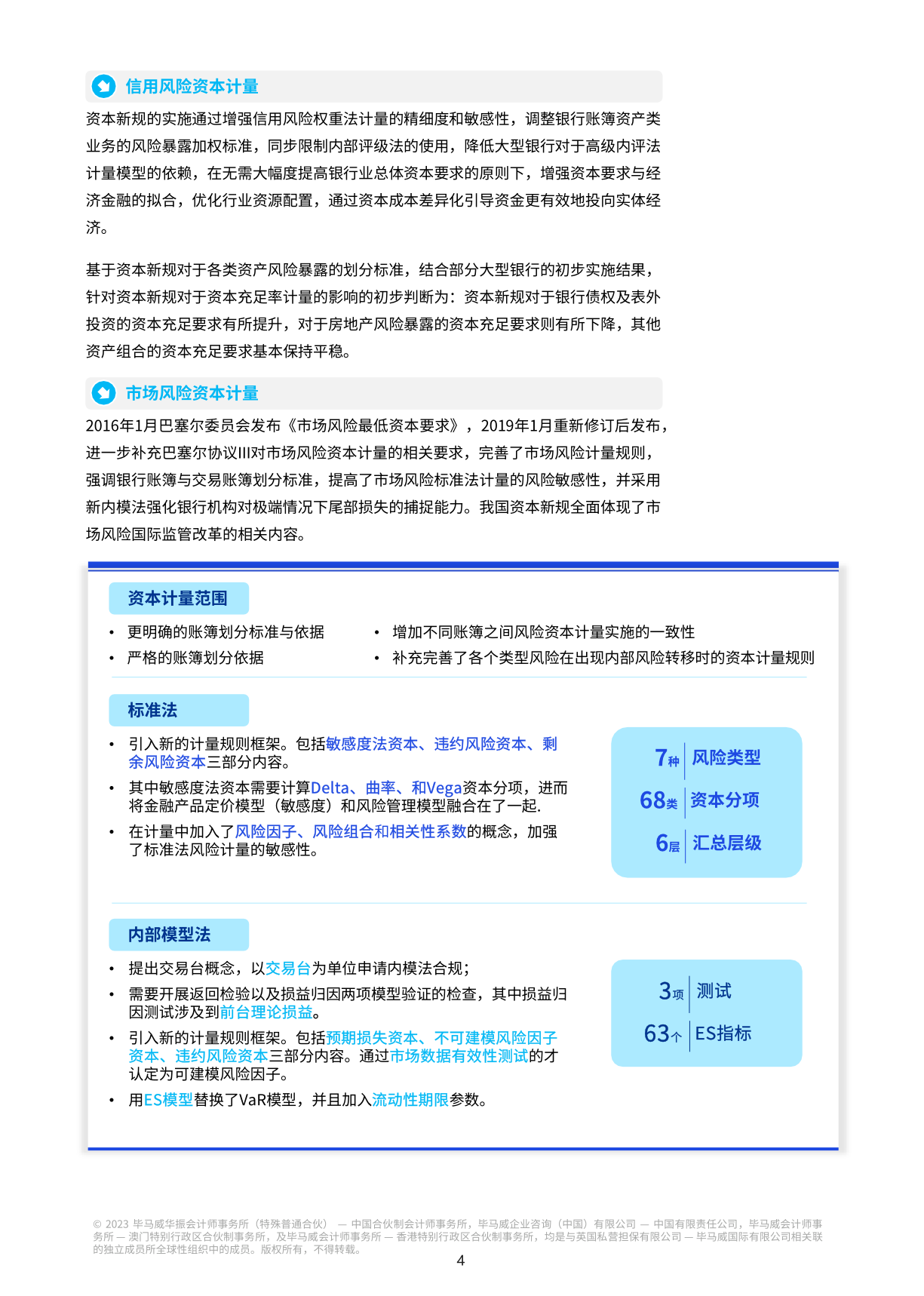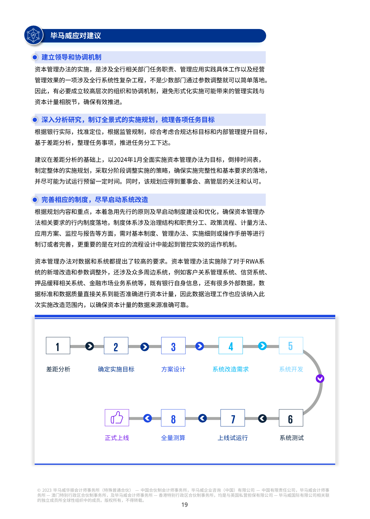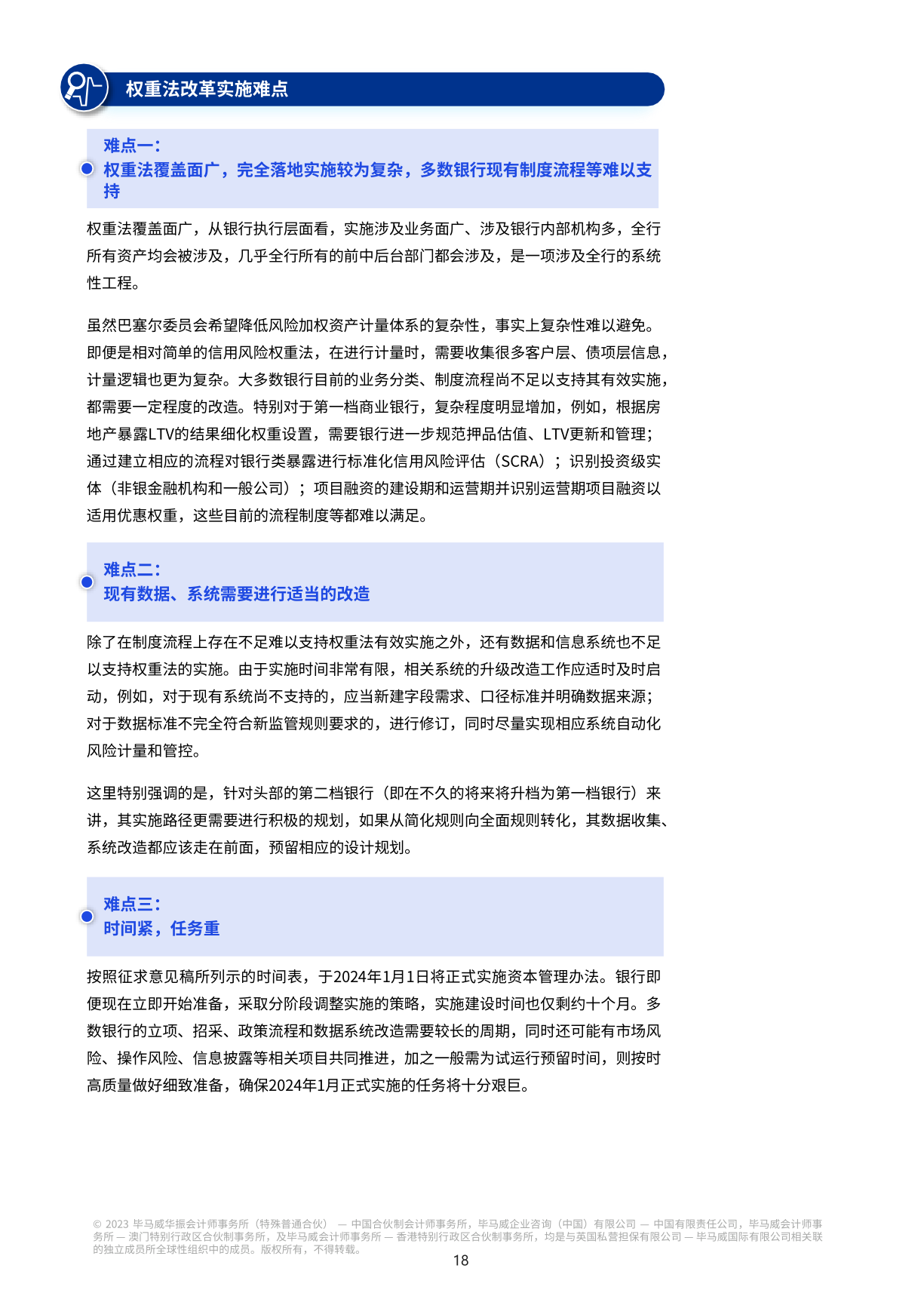 对我国各类商业银行来说,新资本规定的出台意味着新的变化和挑战。资本和风险加权资产计量规则的升级将提高银行对风险计量能力的要求;业务管理模式的转变将指导银行未来的业务发展方向;扩大和完善数据收集范围将加强银行风险管理的数据基础;管理信息系统的转型迫切需要更多的技术和经验支持;资本管理模式的转型将逐步融入银行绩效管理的转型。
