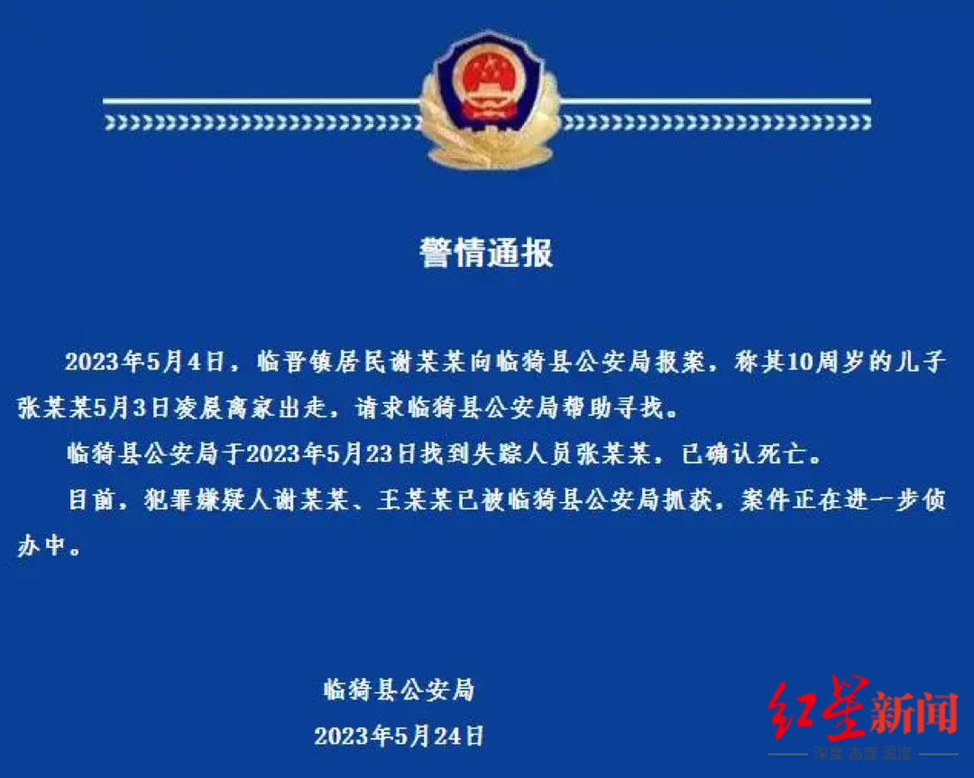 山西省临沂县公安局5月24日通知,5月4日,临晋镇居民谢向临沂县公安局报案,称其10岁的儿子张于5月3日凌晨离家出走,请求临沂县公安局帮忙寻找。