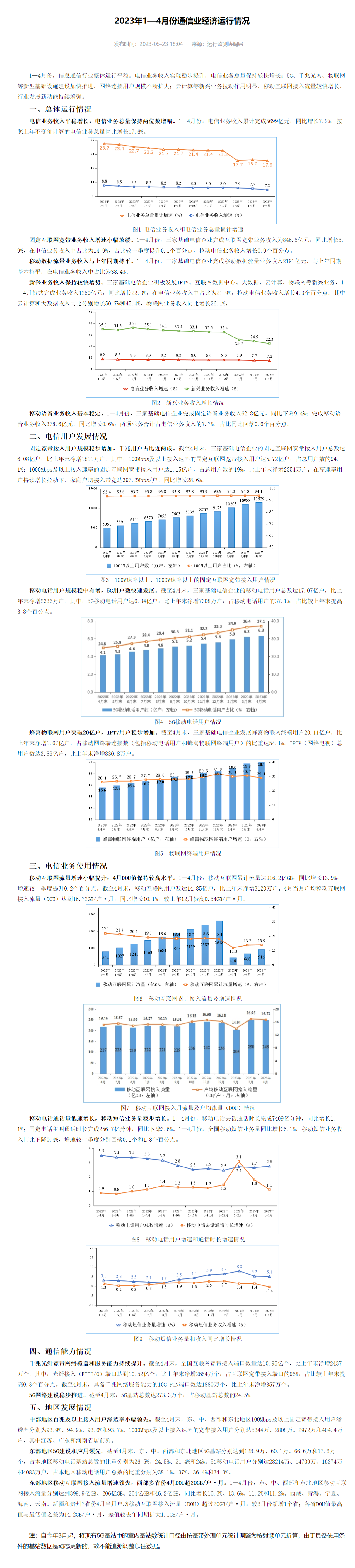 据工业和信息化部网站发布,2023 年 1—4 信息通信行业整体运行平稳。1—4 月份,中国电信业务收入累计完成 5699 亿元,同比增长 7.2%,按去年不变价计算的电信业务总量同比增长 17.6%。同期,5G、千兆光网、物联网等新基础设施建设加快,网络连接用户规模不断扩大;云计算等新兴业务具有明显的驱动作用,移动互联网接入流量增长迅速,行业发展的新驱动力不断增强。
