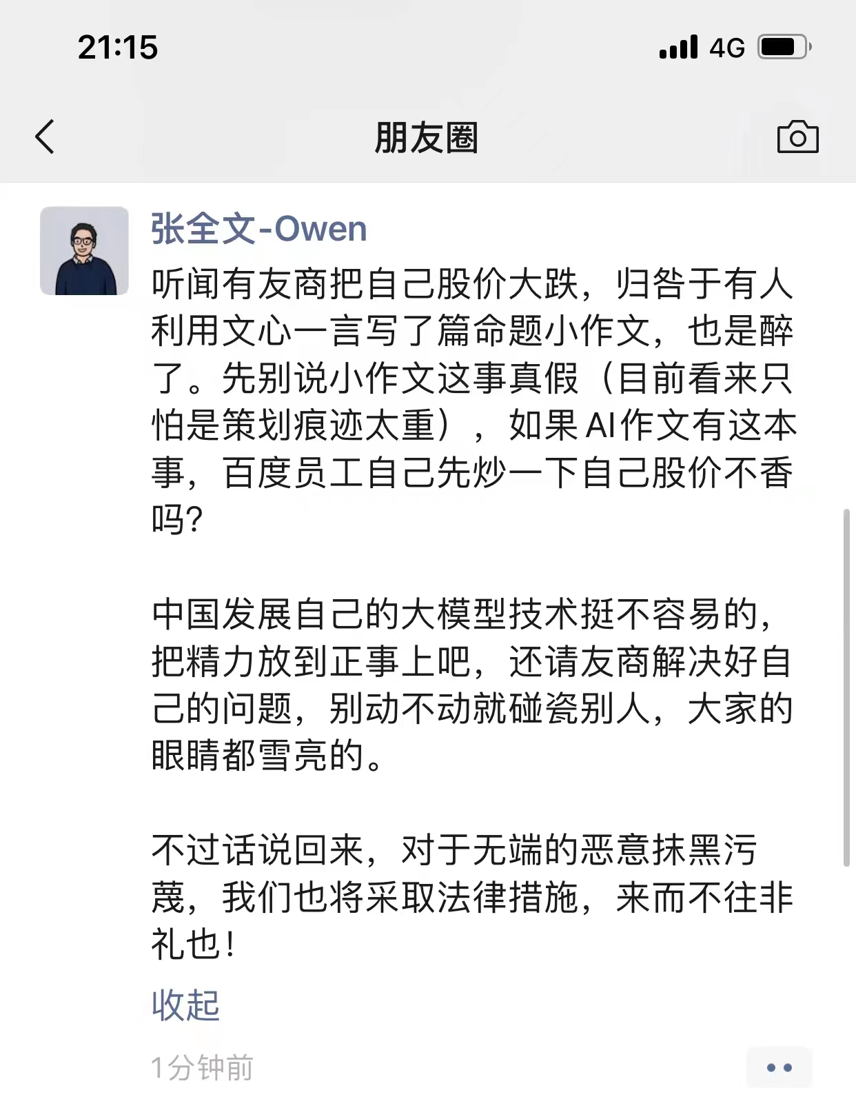 5月24日,文欣市场负责人张全文在朋友圈发帖。听说有朋友把股价大幅下跌归咎于有人用文欣写了一篇命题小作文,他也喝醉了。更不用说小作文的真假了(目前看来策划痕迹太重了)。如果AI作文有这个技巧,百度员工会先炒自己的股价吗?