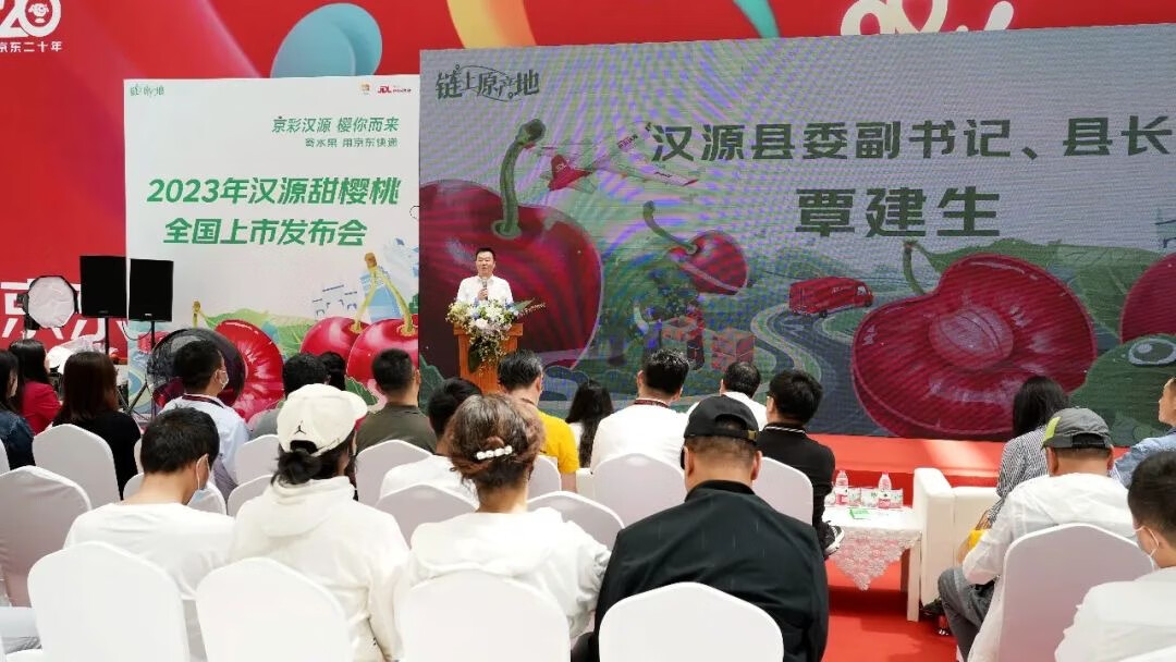 五月樱桃季,汉源别样红。5月23日,“京彩汉源•2023年汉源甜樱桃全国上市新闻发布会在京东北京总部举行。县委副书记、县长秦建生出席了新闻发布会并发表了讲话。京东物流副总裁、公共业务负责人徐勇、京东物流产业带负责人出席了新闻发布会。