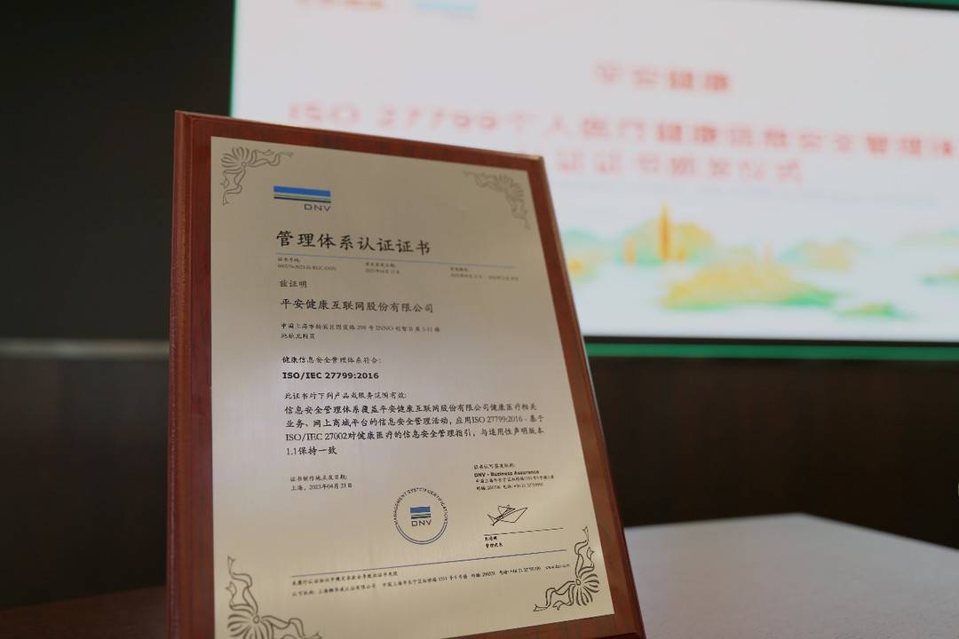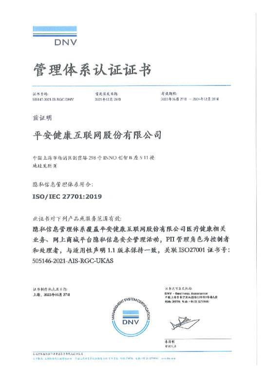 近日,平安健康医疗科技有限公司(股票简称平安好医生) 1833.HK)通过国际认证机构DNV管理服务集团颁发的ISO27799个人医疗健康信息安全管理体系认证,数据安全和信息保护能力再次得到权威认可,成为互联网医疗领域第一家获得DNV认证的企业,它反映了平安健康网络和个人信息安全管理符合行业高水平医疗健康信息安全管理标准体系的要求,能有效保护用户信息安全。