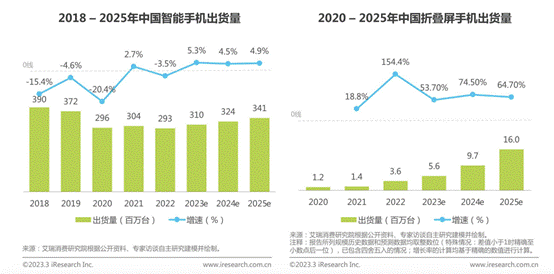 根据艾瑞的咨询报告,直板手机受到硬件和功能迭代速度放缓的限制,遇到了发展瓶颈。其整体销量自2018年以来一直在下降,至2022年已下降至3亿台以下。相比之下,折叠屏手机凭借其创新的形式和差异化的大屏幕体验,实现了多年的逆势增长。特别是2022年,出货量同比飙升154.4%,成为智能手机市场的重要机遇点。