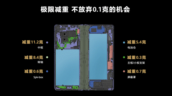使Mate X3已经成为一款超轻折叠大屏幕手机,让用户眼前一亮。它在轻薄设计上极其苛刻,通过主板/小板支架,Spk-box、更换屏幕罩等结构上的材料,极限减肥,不放过0.1克可减肥的技术点。