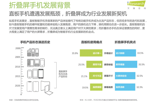 近日,艾瑞咨询发布了中国折叠屏手机市场洞察报告。本报告从政策、市场、行业、品牌、用户等方面详细分析了折叠屏市场的发展现状。报告指出,在行业出货量下降的背景下,折叠屏手机凭借创新形式和新形式下的体验优势,实现了销量逆势增长。此外,海外数据研究机构Techinsights发布报告称,2023年第一季度,中国智能手机出货量6250万部,同比下降13.1%,环比下降12.1%。