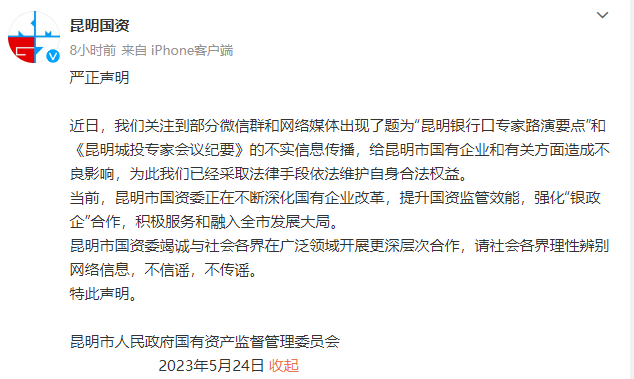 5月24日,昆明国有资产发表严肃声明,最近关注一些微信集团和网络媒体出现了“昆明银行口专家路演点”和“昆明城市投资专家会议纪要”虚假信息传播,对昆明国有企业及相关方面造成不利影响,依法采取法律手段维护其合法权益。