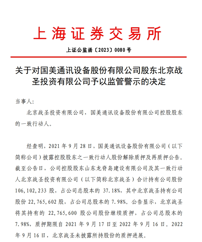 鉴于上述违规事实和情况,上海证券交易所部决定对ST美讯控股股东的一致行动人北京战胜投资有限公司作出监管警告。