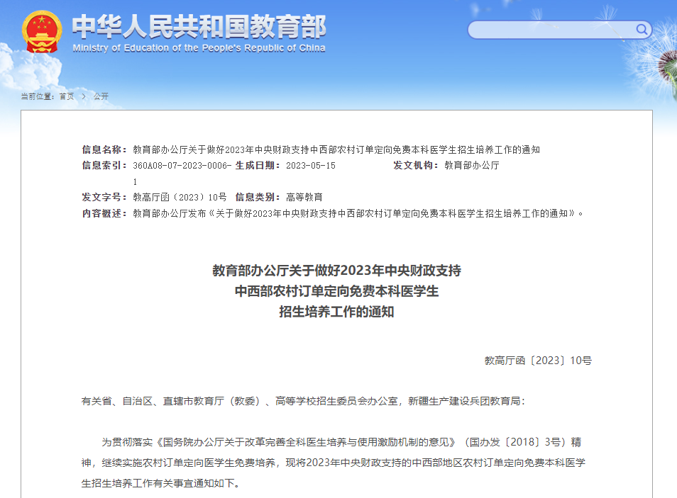 教育部今天发布通知,今年将继续实施农村订单定向医学生免费培训,要求各地做好2023年中央财政支持中西部农村订单定向免费本科生招生培训工作。