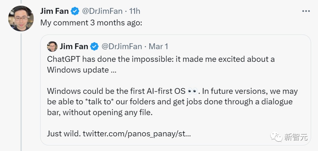 英伟达首席AI科学家Jimm 三个月前,Fan还发现了自己的神预言:Windows可能是第一个AI加持的操作系统。