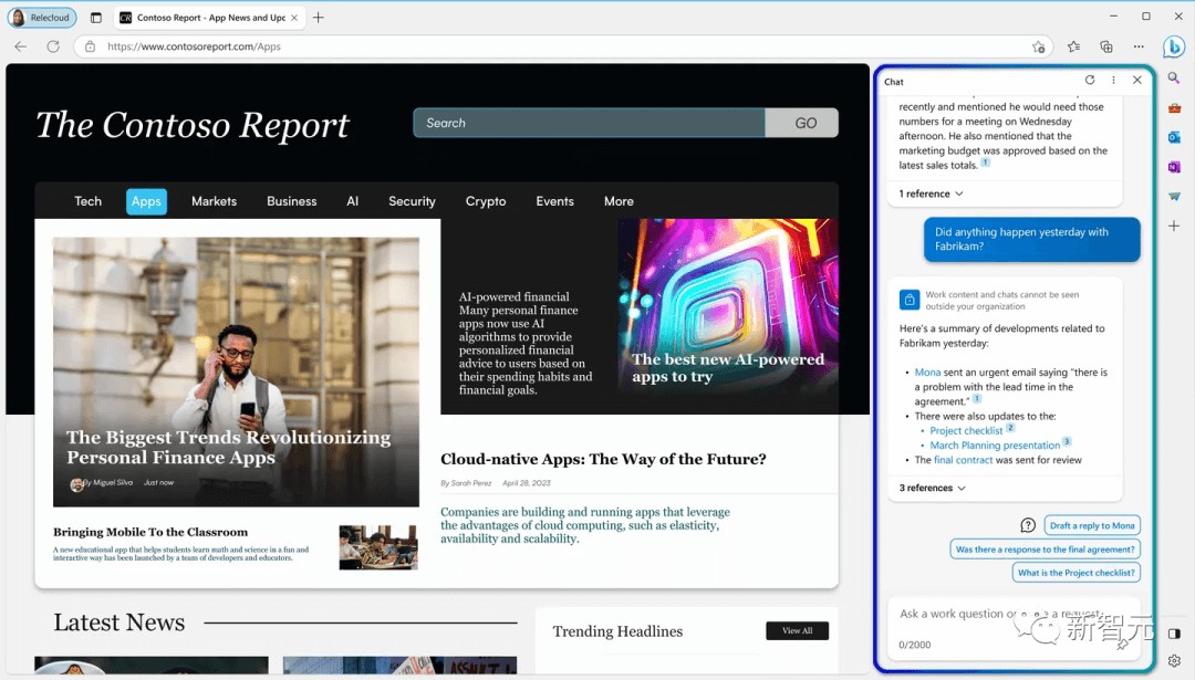 全新的微软365 Copilot联动后,用户还可以在Edge中使用聊天机器人,与Office联动、Outlook,其他搭载微软365 互动Copilot的应用。