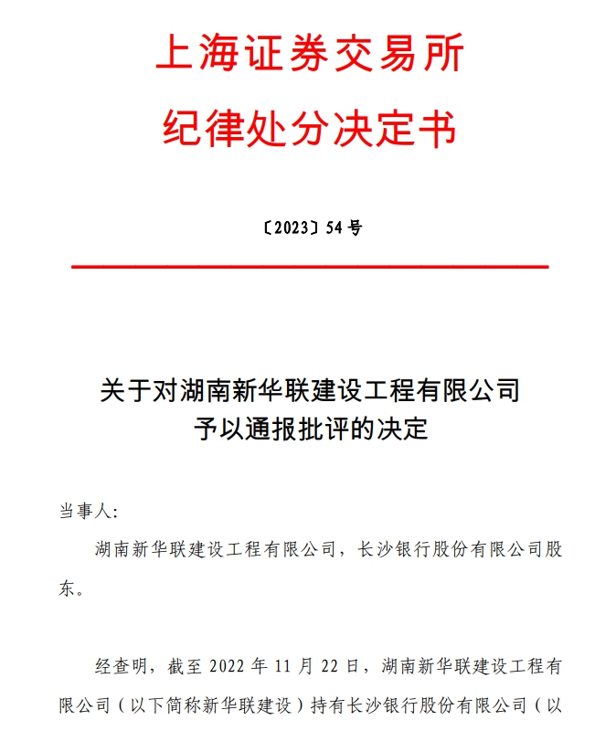 鉴于上述违规事实和情况,上海证券交易所作出了以下纪律处分决定:批评长沙银行股份有限公司股东湖南新华联建设工程有限公司。对上述纪律处分,上海证券交易所将通知中国证监会,并记录在上市公司的诚信档案中。