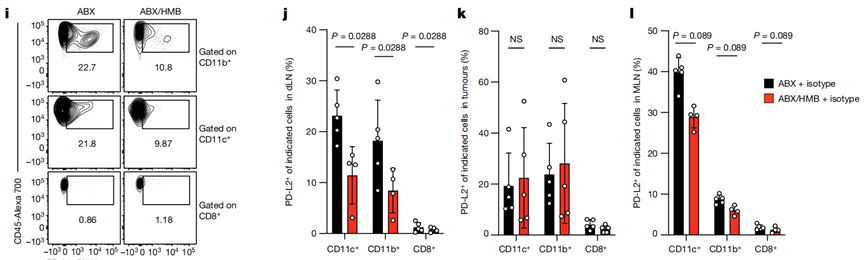 为了了解肠道细菌在免疫细胞和肿瘤之间的激烈战斗中发挥了什么作用,研究人员分析了免疫检查点的表达。结果表明,肠道菌群可以调整部分细胞上的PD-L2表达水平。与肠道细菌被抗生素处理的小鼠相比,结直肠癌小鼠肠道和肿瘤引流淋巴结中的PD-L2水平降低。