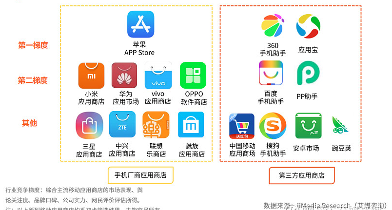 然而,由于国内第三方应用商店市场竞争激烈,下载渠道不断被手机制造商自己的应用商店覆盖,亚马逊应用商店在中国市场并没有取得很大的成功。根据比达咨询此前发布的《中国智能手机品牌监控报告》,安卓手机用户安装的第三方应用商店占80.7%;手机厂商应用店占19.3%,地位不断提升。据艾媒咨询统计,苹果APP在国内移动应用商店行业的竞争梯度上 Store、360手机助理和应用宝是第一梯队;小米、华为等手机制造商的应用商店、百度手机助理和PP助理是第二梯队;ZTE、联想等手机制造商的应用商店和中国移动应用商店是第三梯队。